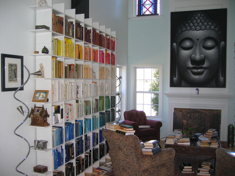 bookcase arranged by spine color, the Serif of Nottingblog wrote: "What you've done privileges the unexpected connections between books, between subjects. Despite your blog being 'Abecedarian,' your book organization realizes that knowledge can be organized or accessed via a totally different set of assumptions."