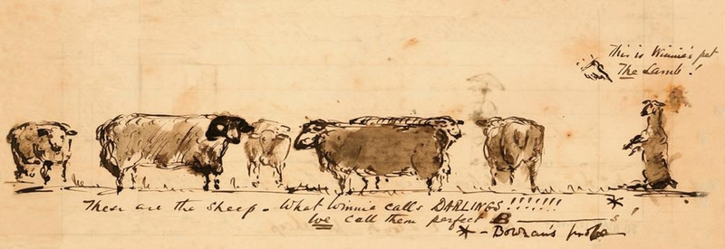 "These are the sheep -- What Winnie calls darlings!!!!!!! We call them perfect b------s." By Charles Rawson. Courtesy of the State Library of Queensland.