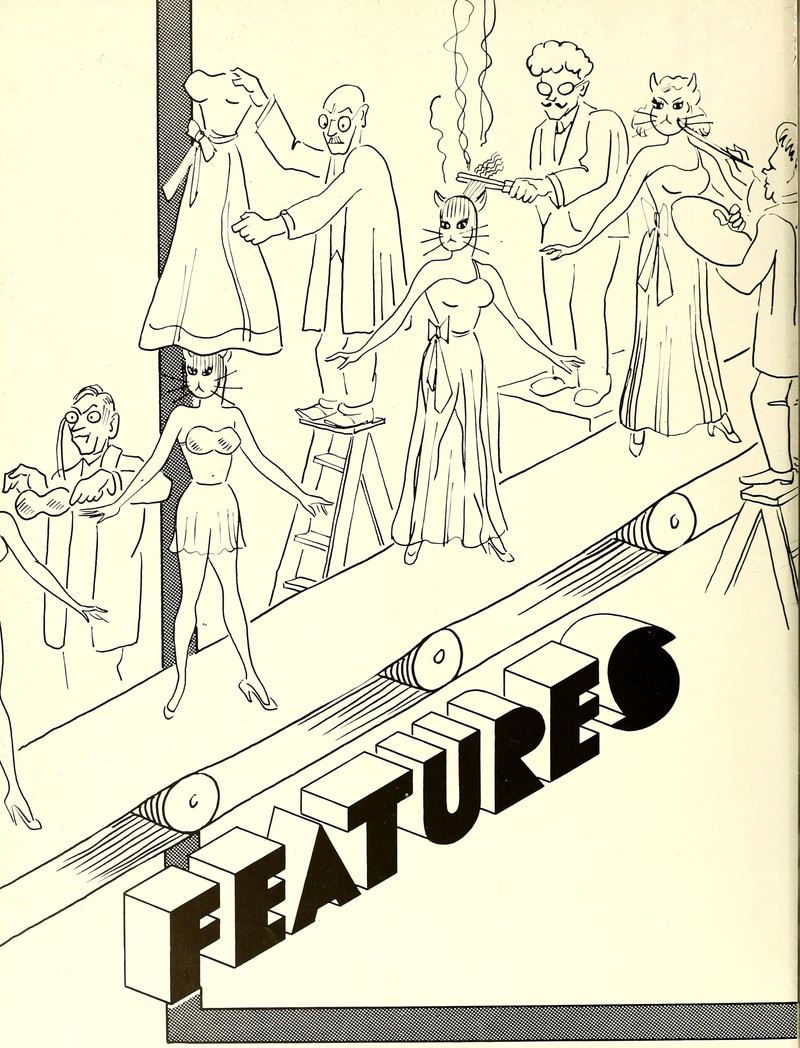 #vintage illustration #vintage yearbook #yearbook #cat people #cat headed #conveyor belt