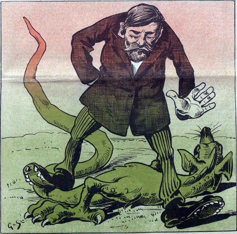 Using toothy shoes to stomp dragons is no longer considered humane.  From Nebelspalter, 1910.