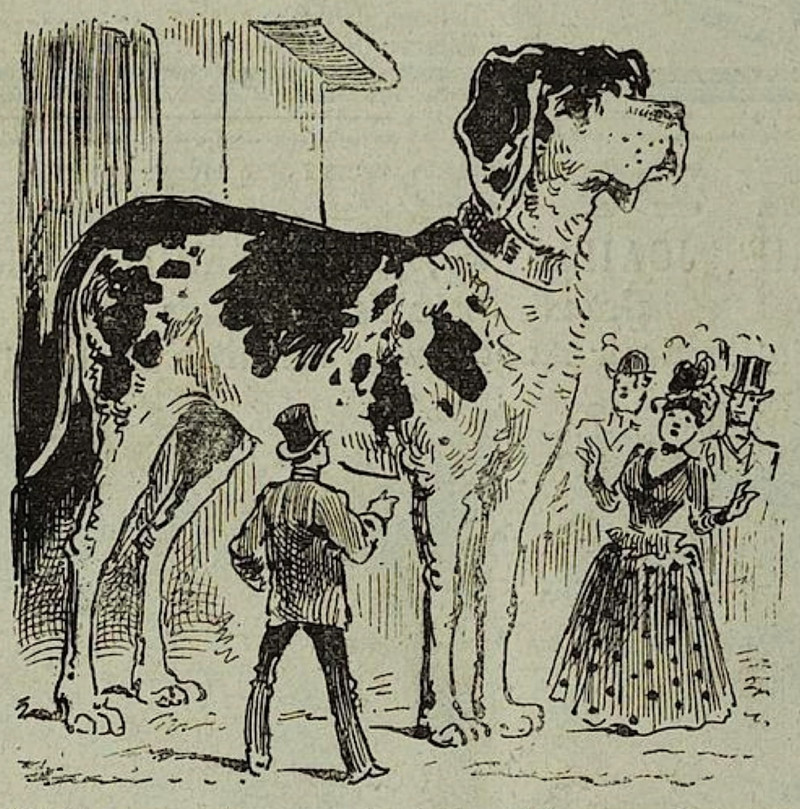 Here's a precursor to the giant dog Clifford.  From Le Charivari, 1887.