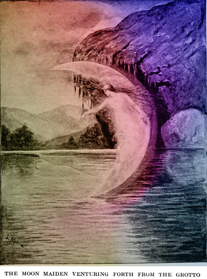"The moon maiden venturing forth from the grotto."  From As Old as the Moon, Cuban Legends by Florence Jackson Stoddard, 1909.