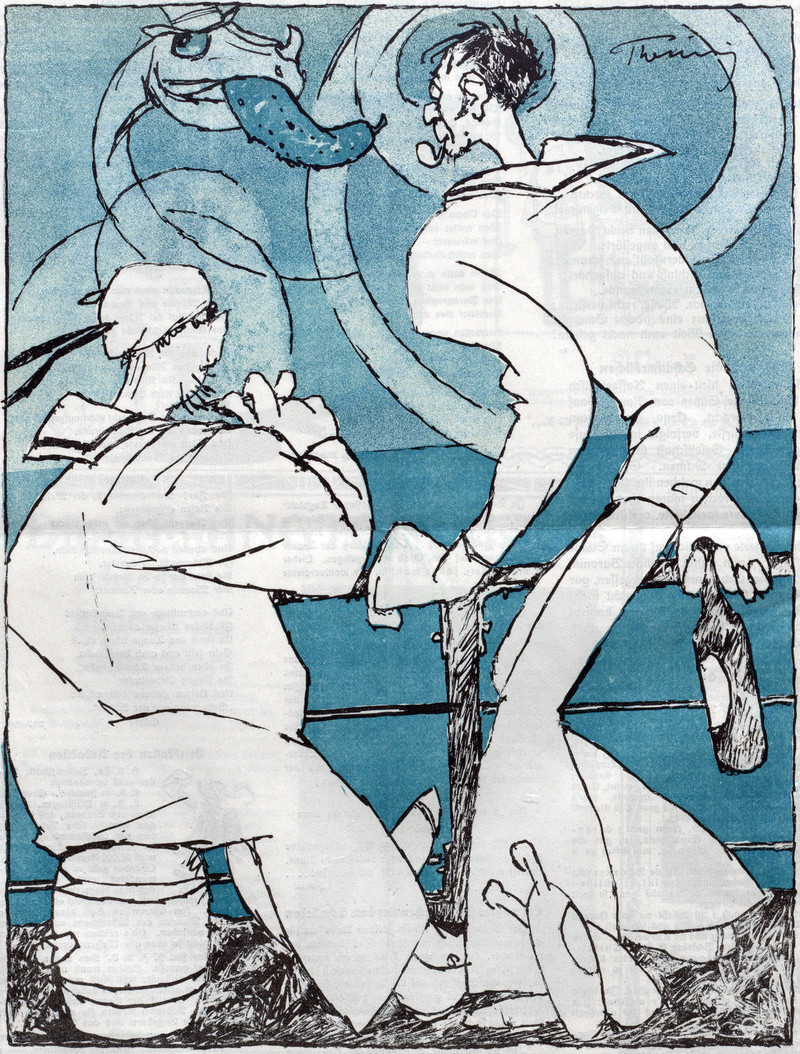 A sailor's secret -- all a sea serpent really wants is a pickle.  From Nebelspalter, 1914.