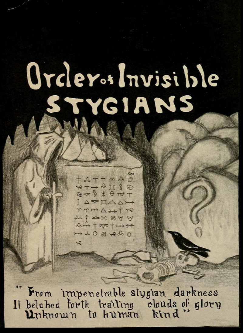"Order of Invisible Stygians.  From impenetrable Stygian darkness it belched forth trailing clouds of glory unknown to human kind."  From the University of North Carolina at Chapel Hill's 1920 yearbook.  See How to Hoodoo Hack a Yearbook.