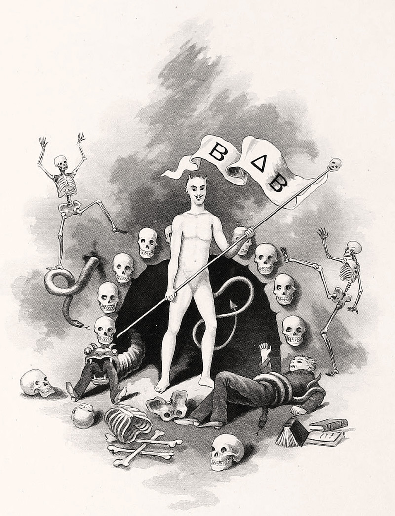 #vintage illustration #devil #skeleton #skull #fraternity #vintage yearbook #yearbook #secret society
