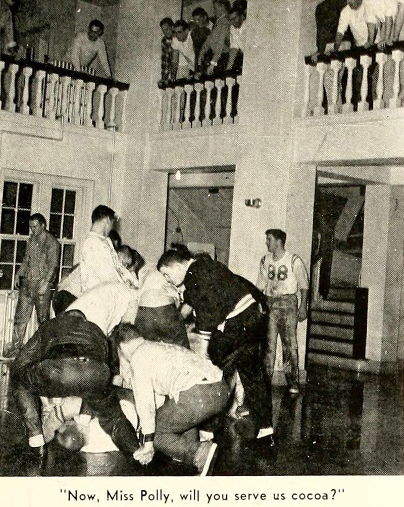 Only funny to a Southern sensibility: the captions read, "Now, Miss Polly, will you serve us cocoa?" and "Leave it alone and call it peach melba."  From Sewanee's 1960 yearbook.