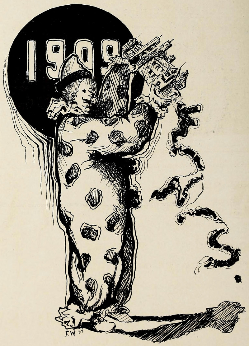 Today's giant clown dumping tiny people out of a building is from Washington University's 1909 yearbook.