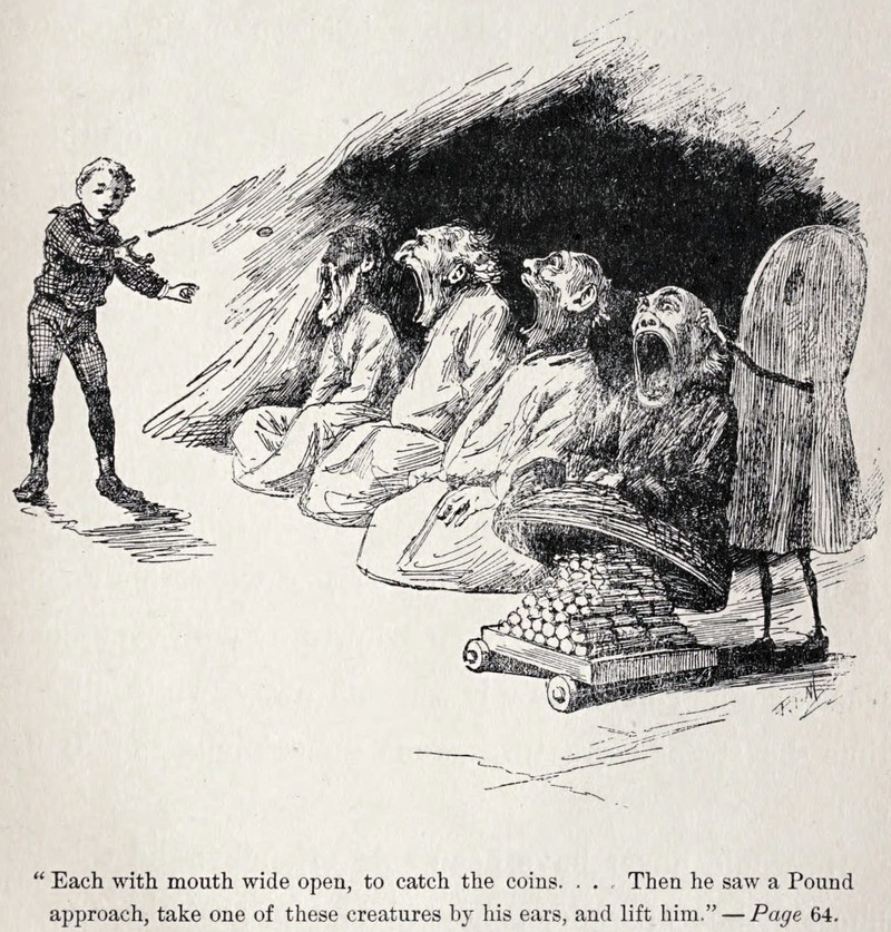 Mouths open to catch coins.  From The Kingdom of Coins by Bradley Gilman, 1894.
