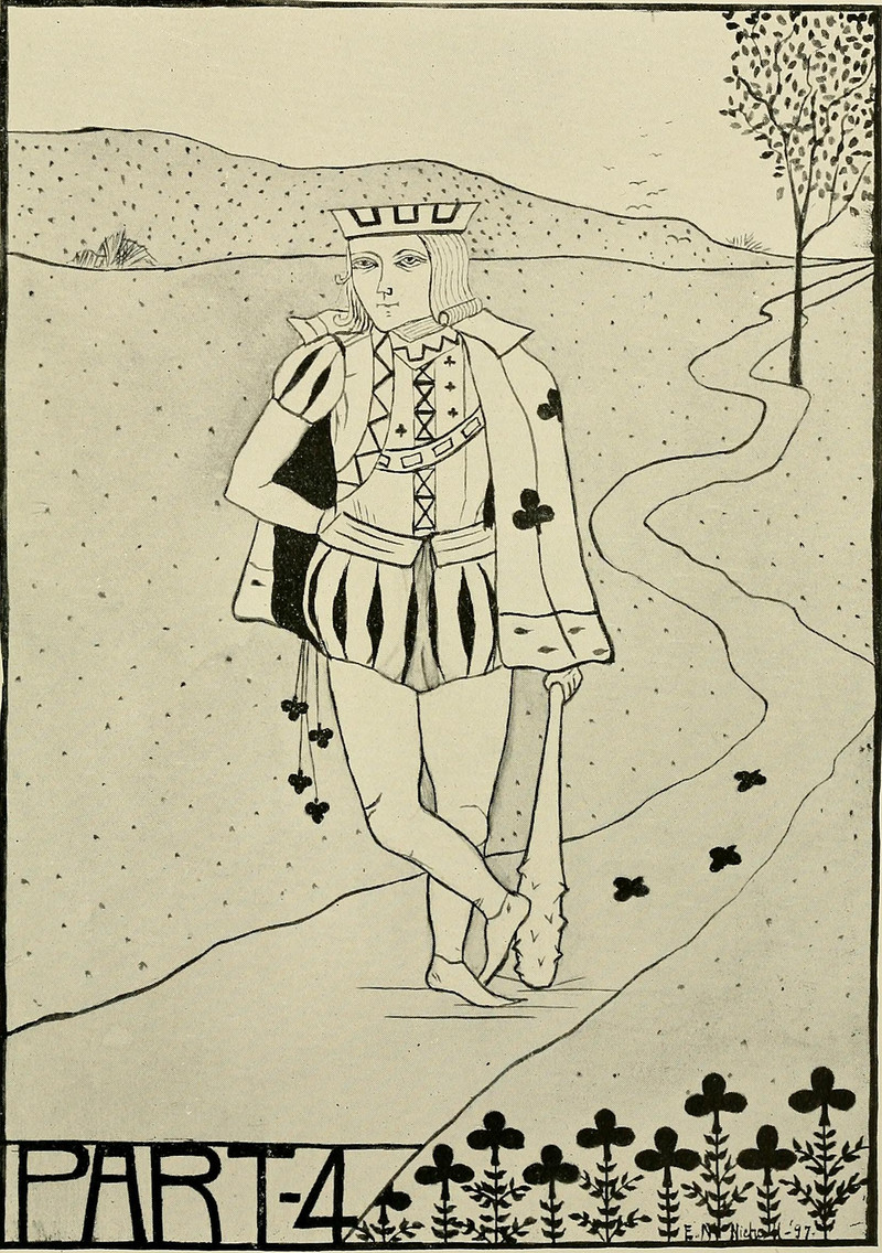 Perhaps those clubs on the path behind the king are the footprints and spiked-stick print from where he originally posed before the sketch artist asked him to come a bit closer. From Swarthmore's 1898 yearbook.