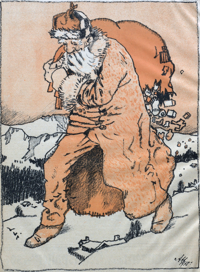 Rare to see Santa Claus depicted as the giant that he is.  From Nebelspalter, 1918.