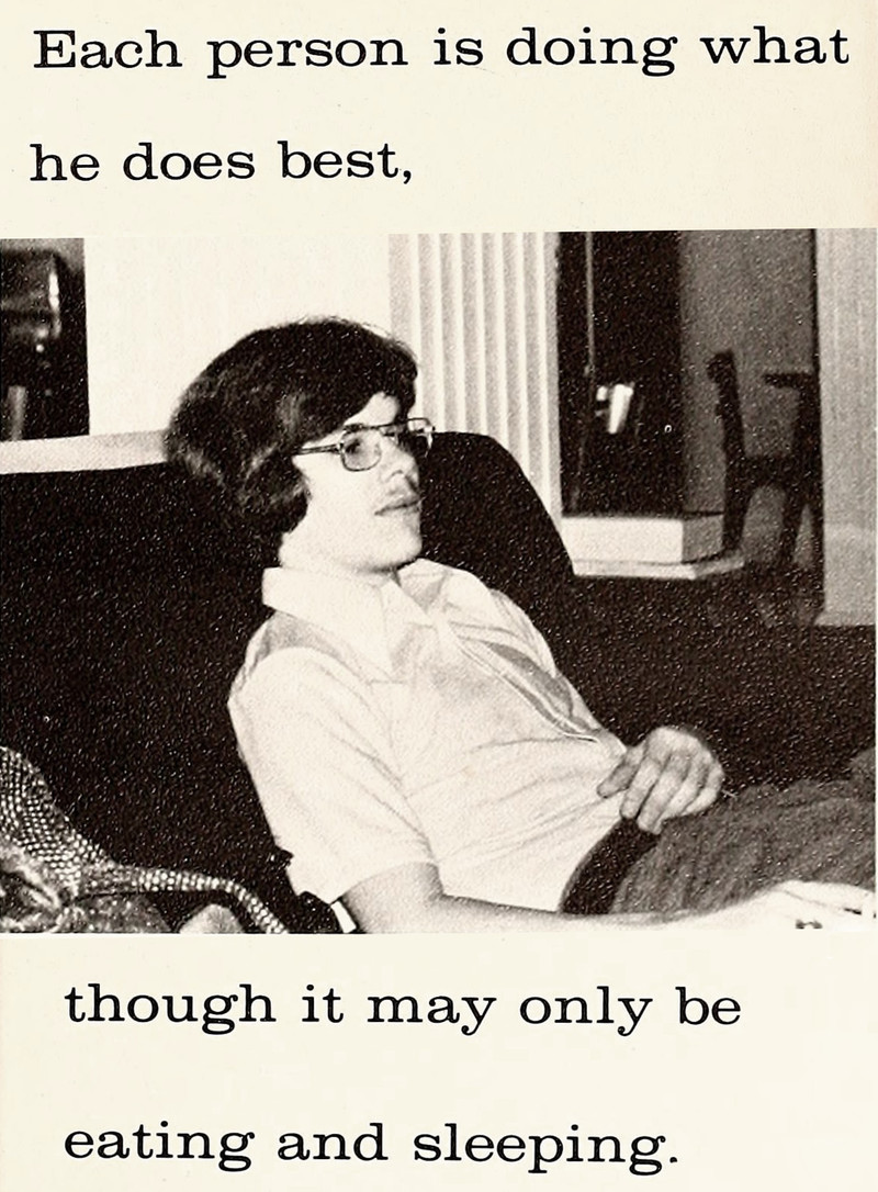 "Each person is doing what he does best, though it may only be eating and sleeping."  From Mitchell's 1974 yearbook.