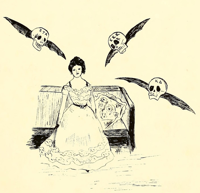 #vintage illustration #vintage yearbook #skulls #yearbook #secret society #sororities #flying skull #winged skull