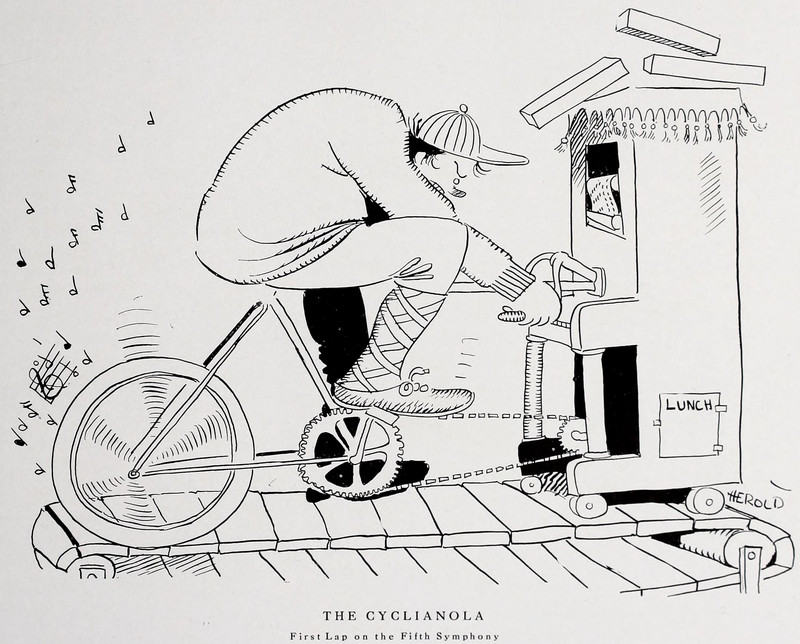#piano #exercise #bicycle #player piano #invention #vintage yearbook #vintage illustration