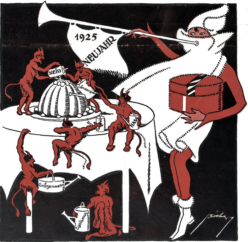 Some new year's envy, greed, hatred, megalomania, and egotism.  From Der Bärenspiegel, 1925.