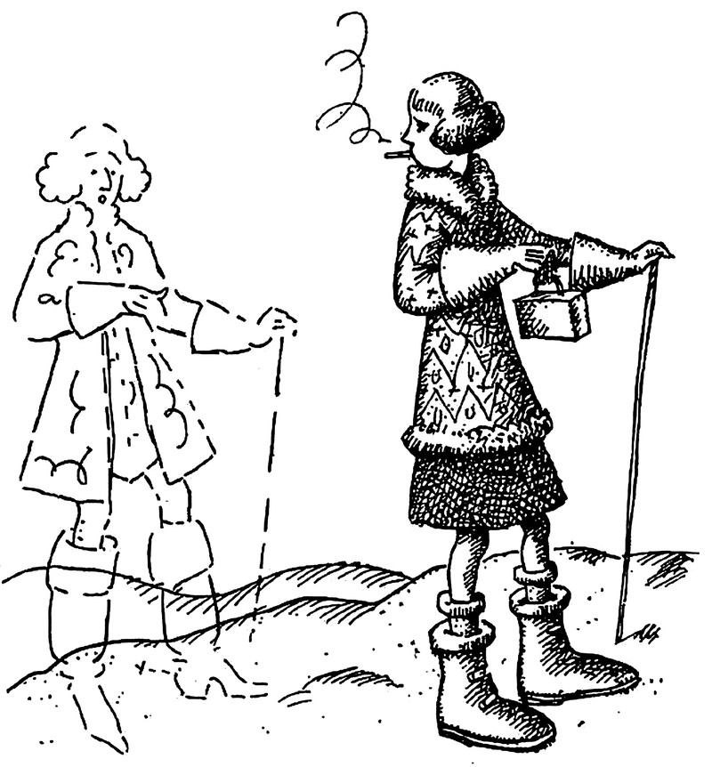 When women's fashion regresses to men's fashion of the past.  From Der Bärenspiegel, 1925.