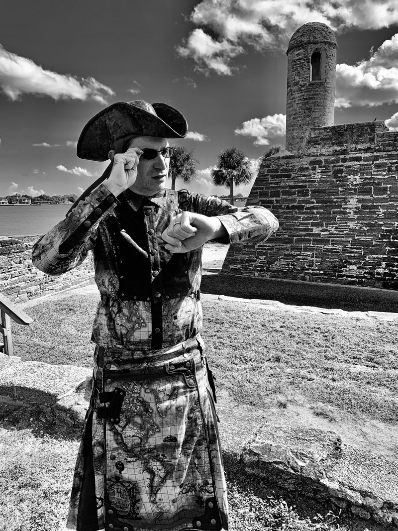 In our photo of chronologician Michael, he is not actually looking at his invisible watch but rather consulting the living map that he's wearing.  (A living map never gets outdated but rather, remaining mysterious to its core, is a provocation to experience, casting as it does the luminosity of presence.  A living map is full of latencies, providing criteria by which a competent discoverer may test his projected conjectures.)