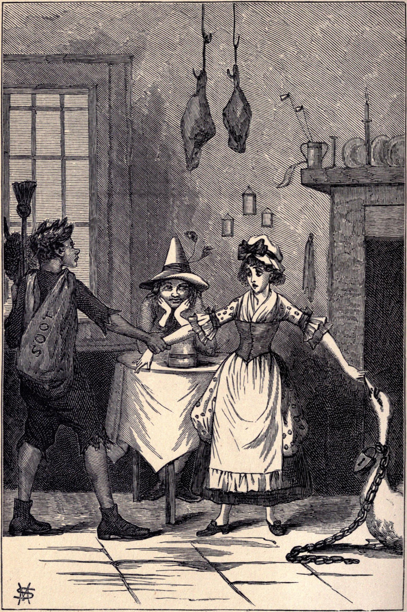 Getting grasped by a soot-bearing chimney sweep is a good way to get dirty while you feed your chained goose. From Alice and Other Fairy Plays for Children by Kate Freiligrath-Kroeker and illustrated by Mary Sibree, 1881.