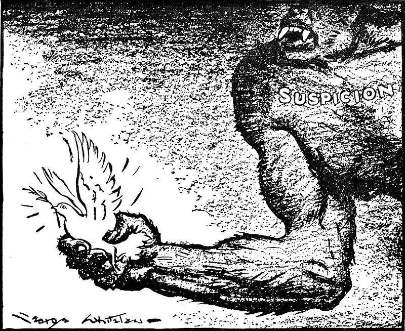 #vintage illustration #political cartoon #demon #dove #suspicion #war and peace #peace dove