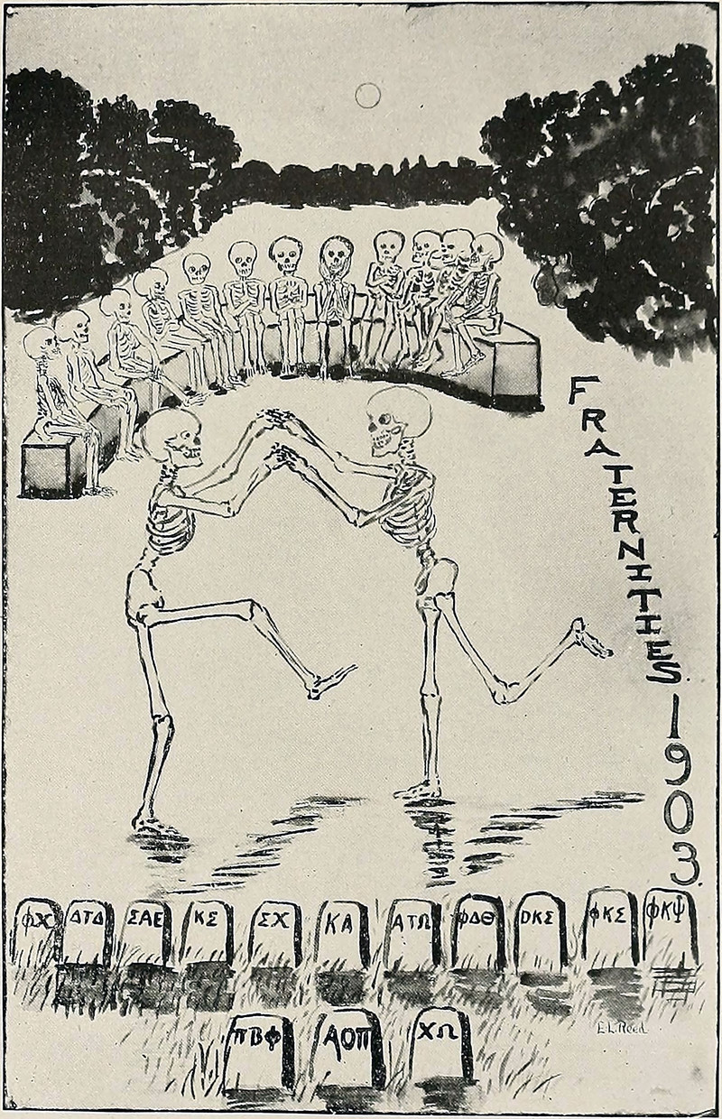 #vintage illustration #skeleton #dance of death #fraternity #vintage yearbook #yearbook #dancing skeleton