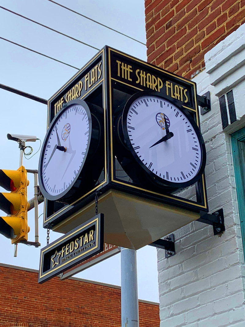 At the Sharp Flats, in Salem, Virginia, the clocks simultaneously show 10:40 and 11:40. As constant investigators of such phemonena, we diagnosed the problem at a glance. Note how the treble clef on the clockface is backwards. It's been said that clinging to backward symbols keeps society from moving forward without the weight of baggage from the past.