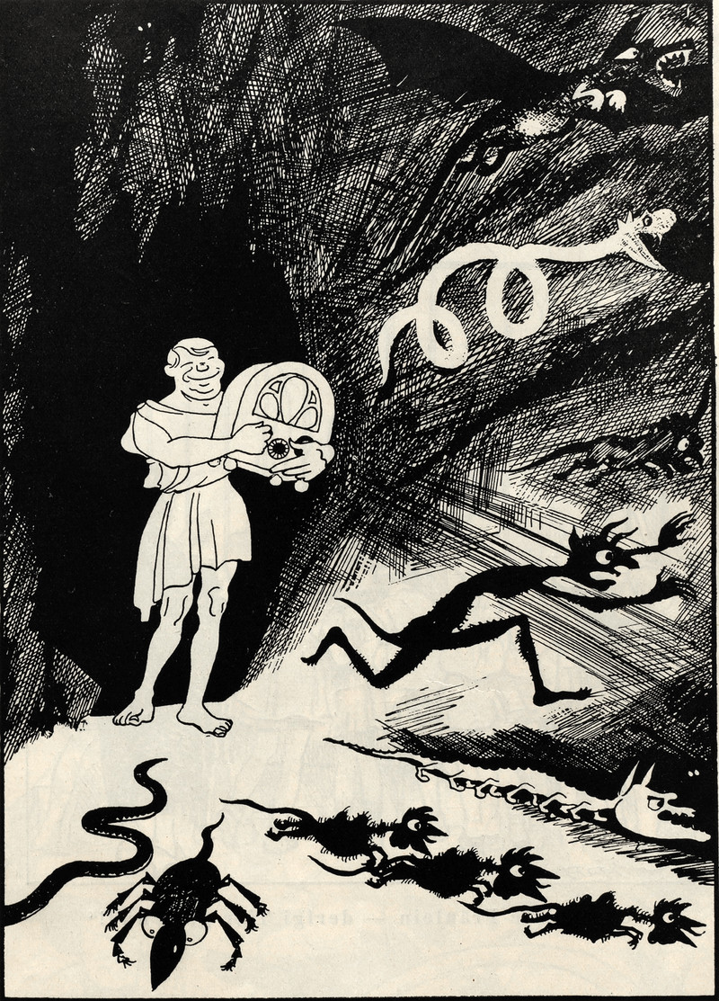 #vintage illustration #demon #snake #cave #radio