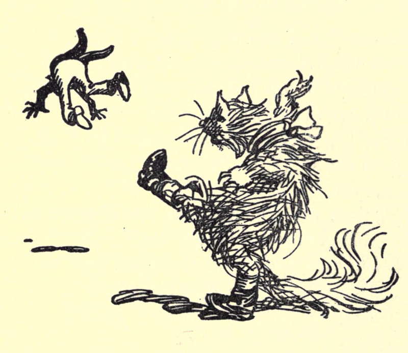 Kicked by a cat. From Grimm Tales Made Gay by Guy Wetmore Carryl and illustrated by Albert Levering, 1902.