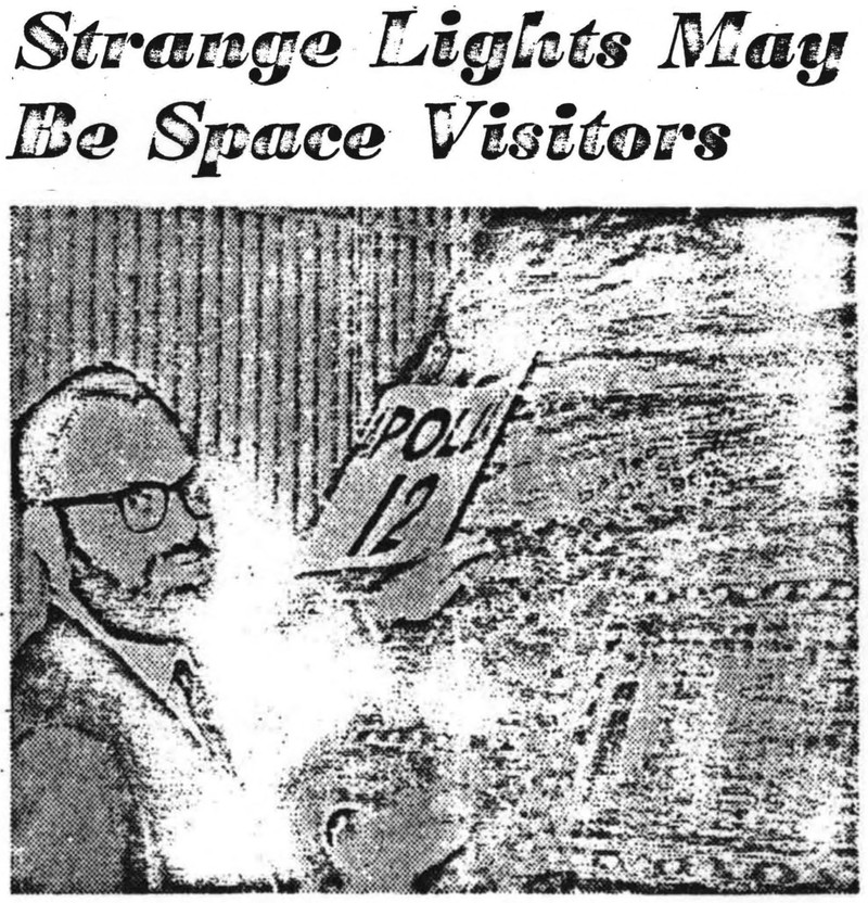 Nice surreal effect courtesy of scanning photocopies of newsprint.  "Strange lights may be space visitors."  From UFO Newsclipping Service, 1971.