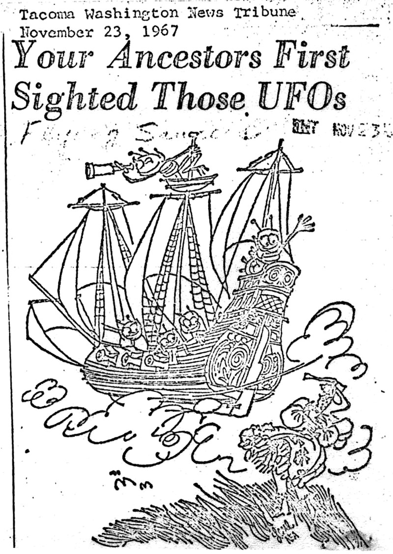You may be surprised to learn that "your ancestors first sighted those UFOs."  From UFO Newsclipping Service, 1970.