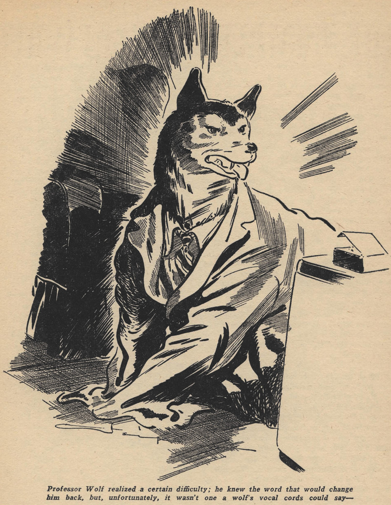 Prof. Wolf knew the word that would change him back, but his vocal chords couldn't pronounce it.  From Unknown, 1942.