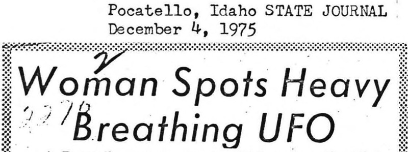 "Woman spots heavy breathing UFO."  From UFO Newsclipping Service, 1976.