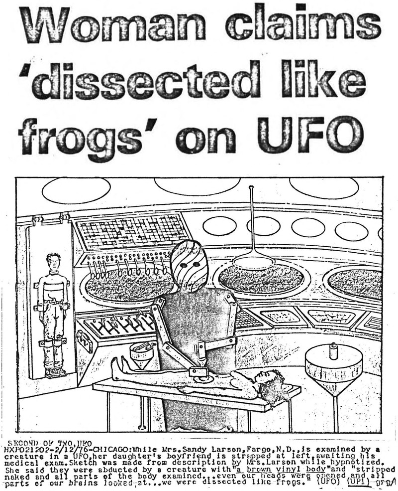 A woman from Fargo ("Fargo" is an anagram of "a frog") was dissected like a frog on a UFO.  From UFO Newsclipping Service, 1976.