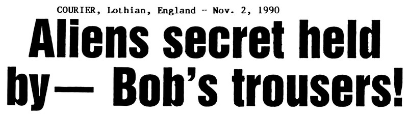 "Aliens secret held by -- Bob's trousers!"  From UFO Newsclipping Service, 1990.