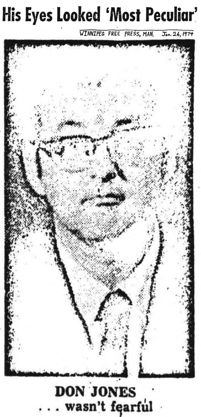 "His eyes looked 'most peculiar,' but Don Jones "wasn't fearful."  From UFO Newsclipping Service, 1974.