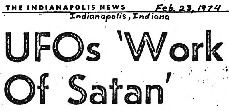 "UFOs 'work of Satan.'"  From UFO Newsclipping Service, 1974.