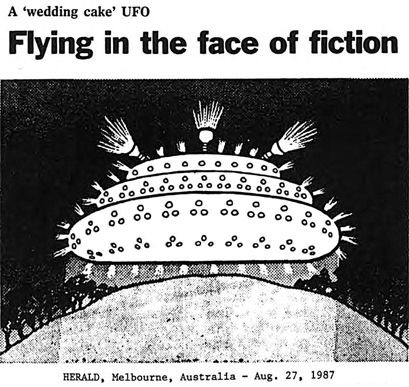 "Flying in the face of fiction.  A 'wedding cake' UFO."  From UFO Newsclipping Service, 1987.