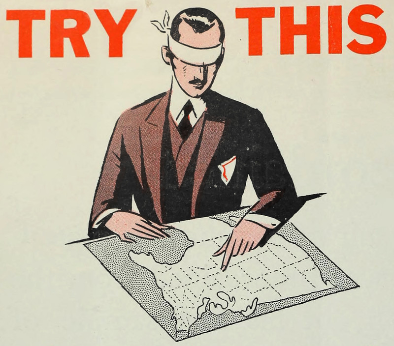 #vintage illustration #vintage ad #blindfold #map #1920s #blindfolded #ad