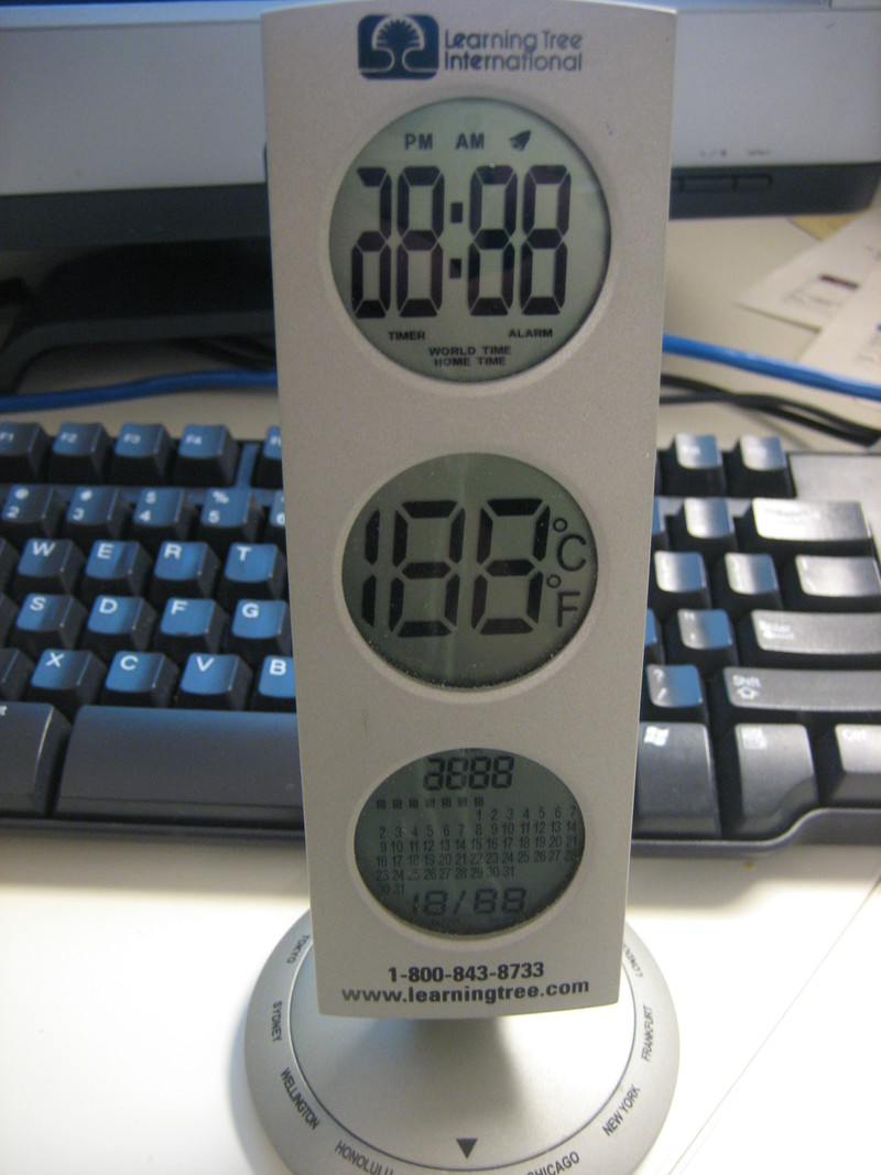 If it's true that "time is mathematics, where there is no past and future" (Alberto Palazzi, Relativity from Lorentz to Einstein), then we can read that backwards 6 and colon as mathematical symbols.  Hence, 8:88 can be understood to mean a "partial derivative of 8 with respect to 88."  Otherwise, we may have to accept that the time is 8:88 PM AM World Time Home Time, and that the temperature is a toasty 188 Celsius Fahrenheit.  Photo courtesy of temporal anomaly investigator Ed Hunsinger.
