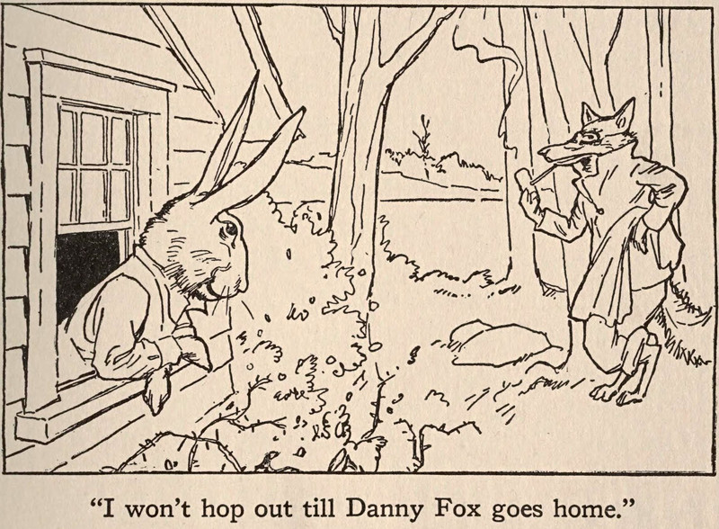 "I won't hop out till Danny Fox goes home."  From Little Jack Rabbit's Big Blue Book by David Cory, 1924.