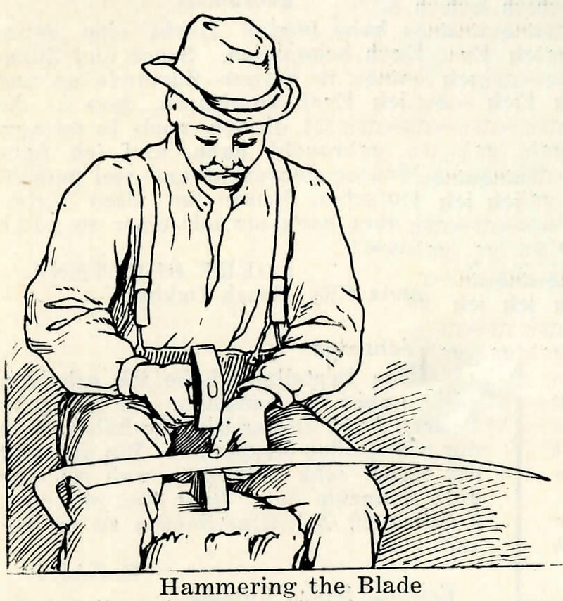 Some folks already know that scythes aren't sharpened by grinding but rather by hammering. It makes for a jagged cutting edge and hardens the metal. From an undated Marugg tool catalog.