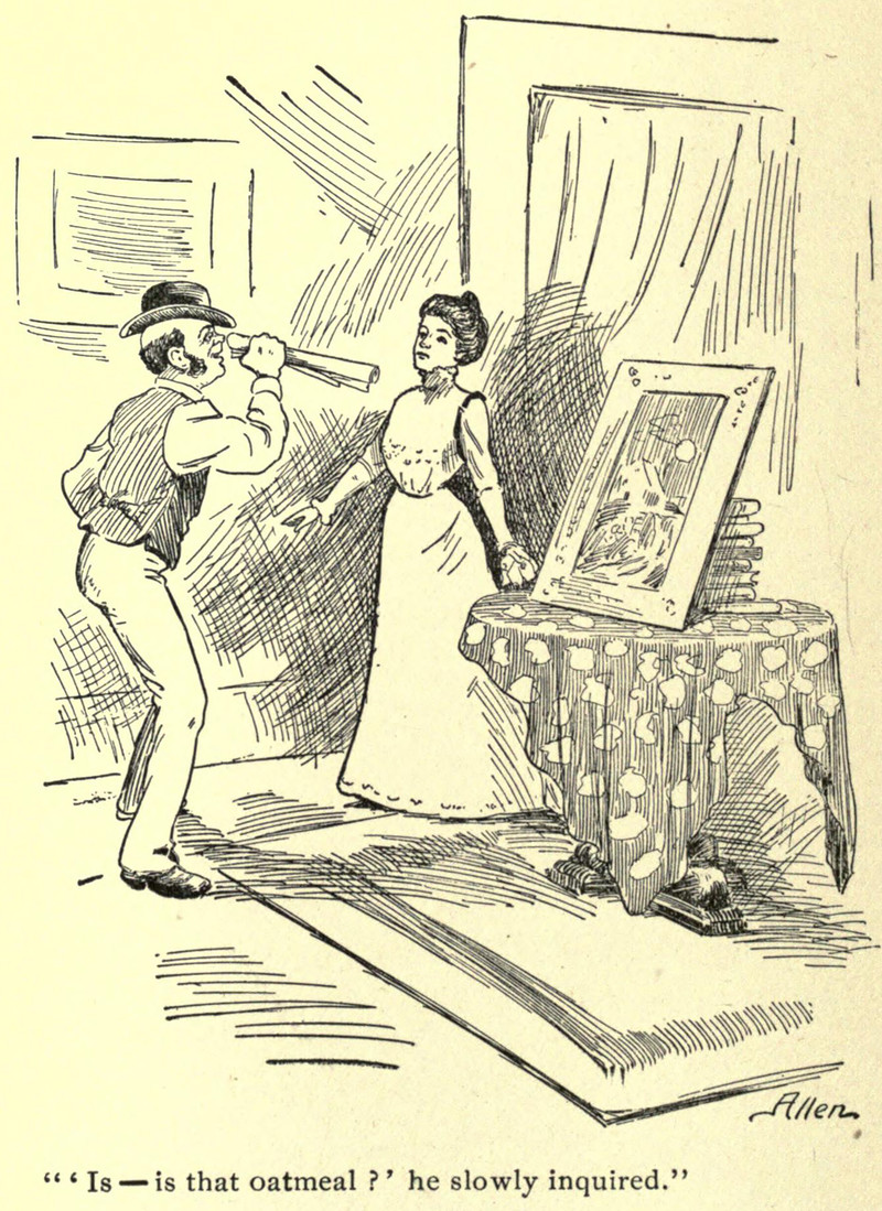 That's our first question, too, upon seeing art: "Is that oatmeal?" From What Happened to Wigglesworth by William Oliver Fuller and illustrated by E. D. Allen, 1901.