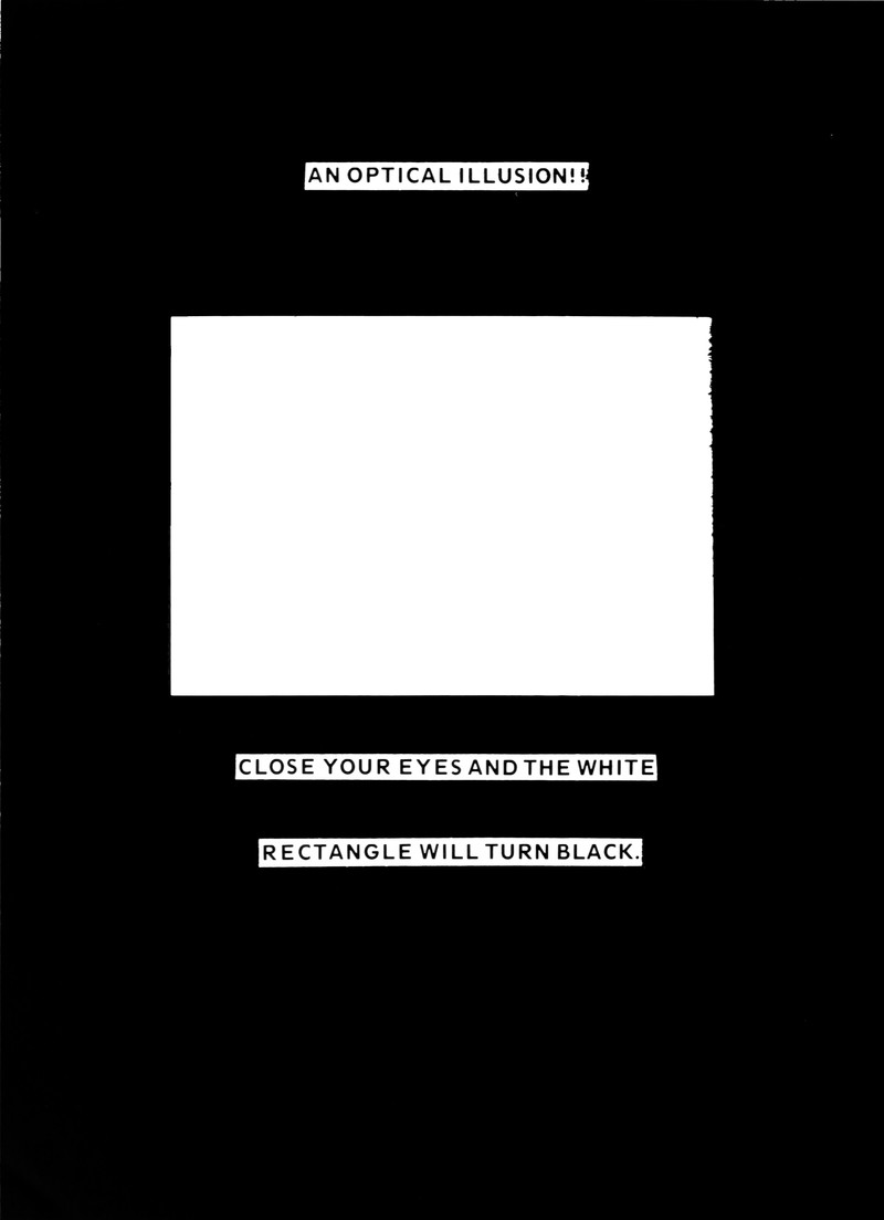 "An optical illusion!!  Close your eyes and the white rectangle will turn black."  From Ya-Hoo, 1954.