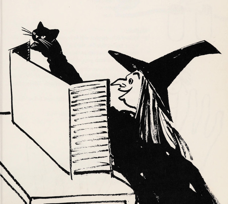 #vintage illustration #witch #black cat #hallowe'en #puppet #puppet show #cat puppet