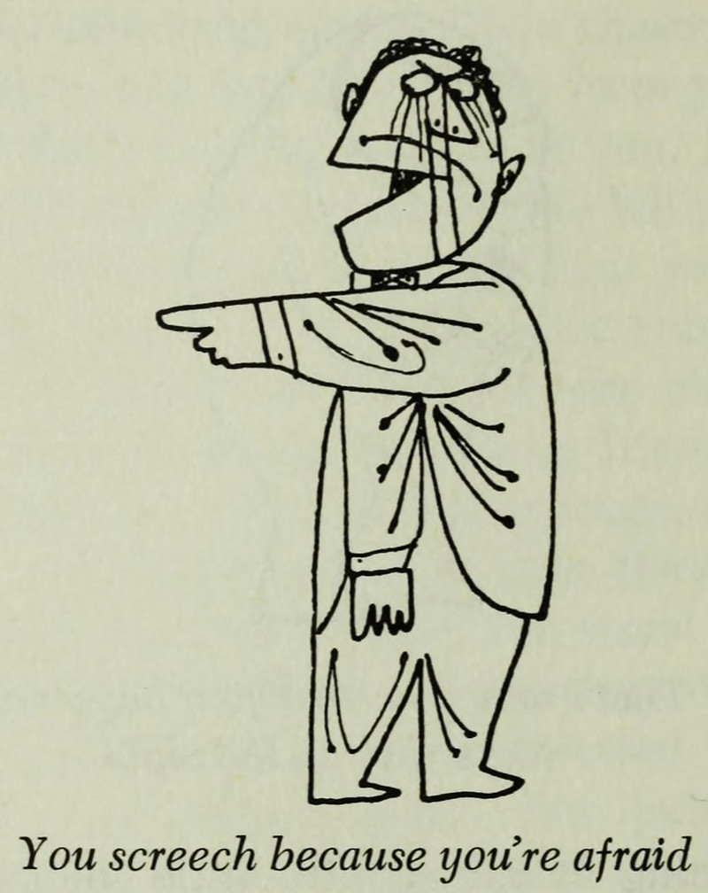 A prediction about Twitter?  "You screech because you're afraid."  From Listen, Little Man! by Wilhelm Reich and illustrated by William Steig.
