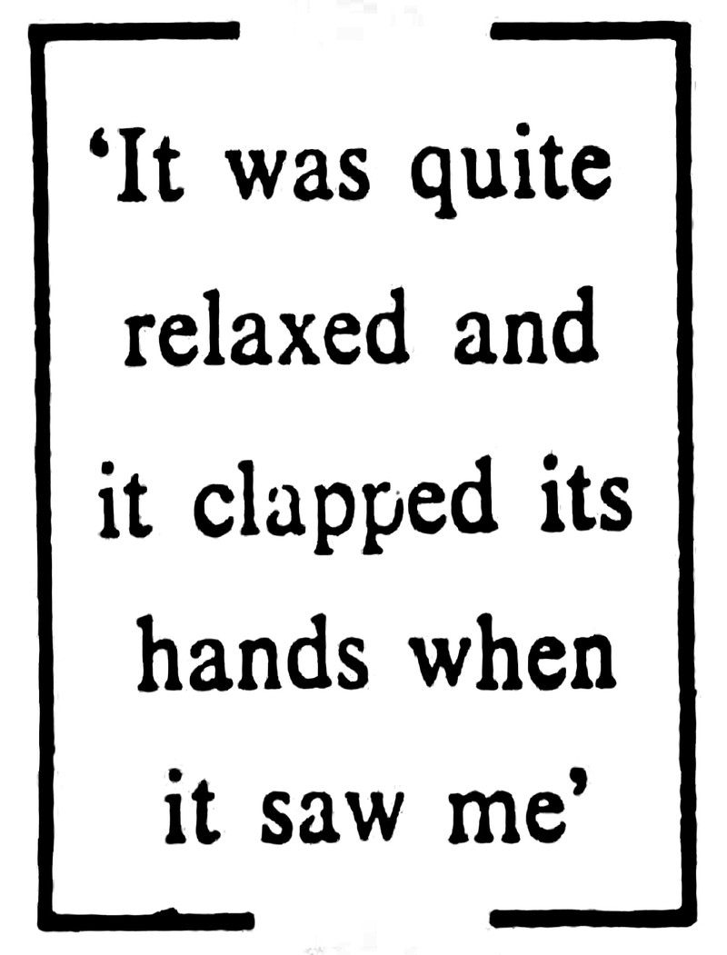 What an ideal Bigfoot encounter!  "It was quite relaxed and it clapped its hands when it saw me."  From UFO Newsclipping Service, 1981.