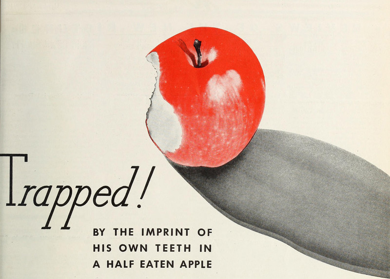 We, too, were once trapped by the imprint of our own teeth in a half-eaten apple, but only in the orchard of imagination.  From Film Daily, 1935.