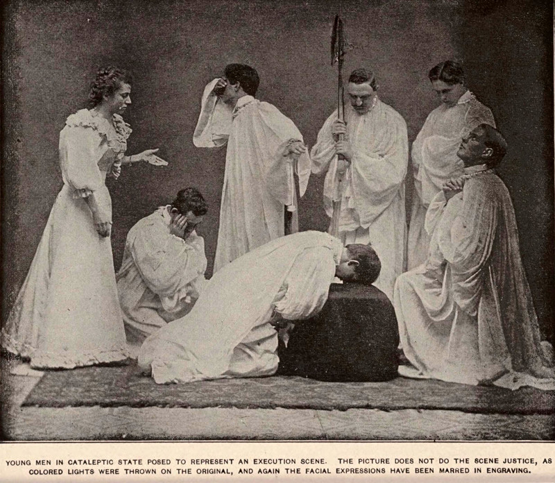 Forced to pose in an execution scene during hypnotic catalepsy.  From Hypnotism As It Is by Xenophon LaMotte Sage, 1900.