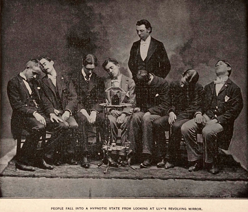 An orgy of men falling into a hypnotic trance after looking at Luv's revolving mirror.  From Hypnotism As It Is by Xenophon LaMotte Sage, 1900.