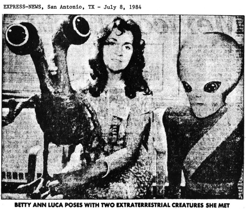 Posing with two extraterrestrial creatures she met.  From UFO Newsclipping Service, 1984.