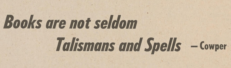 "'Books are not seldom talismans and spells.' —Cowper"  From The Gateway, 1971.  This book reads the mind of the reader: The Young Wizard's Hexopedia.