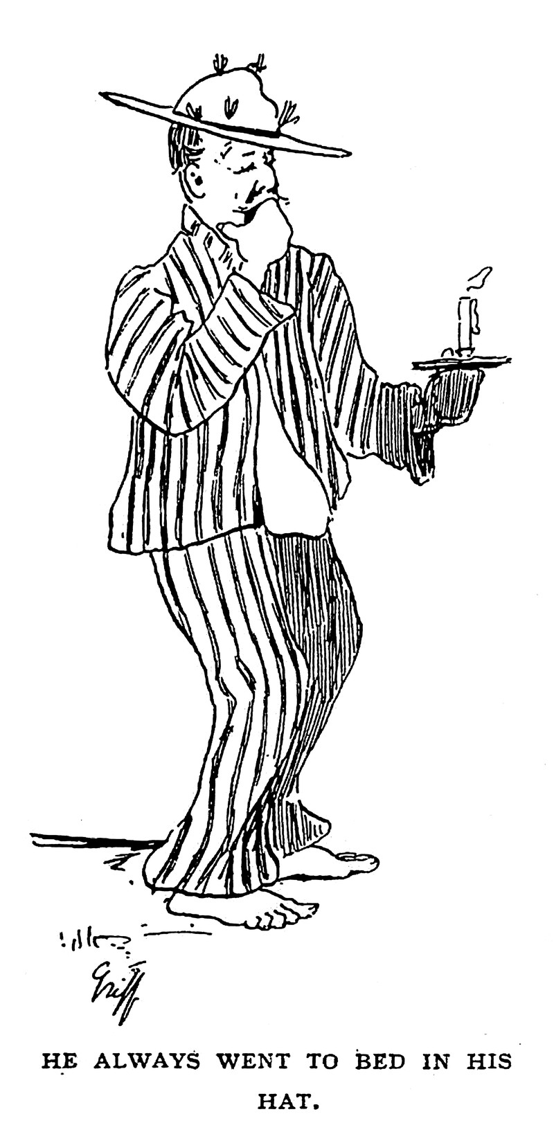 "He always went to bed in his hat."  From Sporting Yarns by Andrew Haggard and illustrated by Griff, 1903.